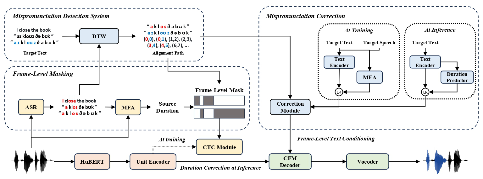 With recent globalization trends, the importance of language education for nonnative speakers has significantly increased. Research on pronunciation correction and speech editing continues to be actively explored to reduce the pronunciation gap between native and nonnative speakers. Traditional speech editing models frequently suffer from unnaturalness at the boundary of the corrected parts and demand substantial input information to effectively synthesize corrected speech. Furthermore, the scarcity of data for curated annotations of mispronounced speech hinders training. This paper introduces UnitCorrect, a mispronunciation correction model that leverages self-supervised unit representations for synthesizing natural-sounding speech and utilizing more phoneme information from speech effectively. We also propose a dynamic time warping based mispronunciation detection system with reduced informational requirements. This system automatically identifies mispronounced segments by comparing the input audio with the target text. Moreover, we supplement the insufficient text information by incorporating frame-level text conditioning into the input of the decoder, therby enabling the synthesis of high-quality speech using a conditional flow-matching decoder. The experimental results demonstrate that UnitCorrect outperforms existing models in terms of mispronunciation corrections and naturalness of speech.
